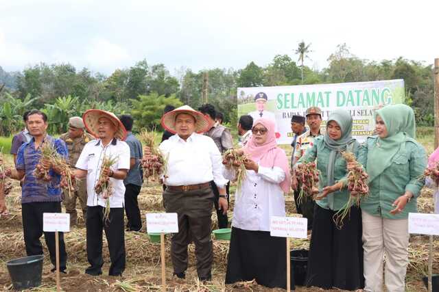 Tapanuli Selatan – Bersama Kelompok Tani (Koptan) Tunas Muda Arse, Bupati Tapsel H. Dolly Pasaribu, S.Pt, MM, panen perdana bawang merah di lahan Koptan Tunas Muda Kelurahan Arse Nauli, Kecamatan Arse, di Kabupaten itu pada Rabu (20/9/2023).