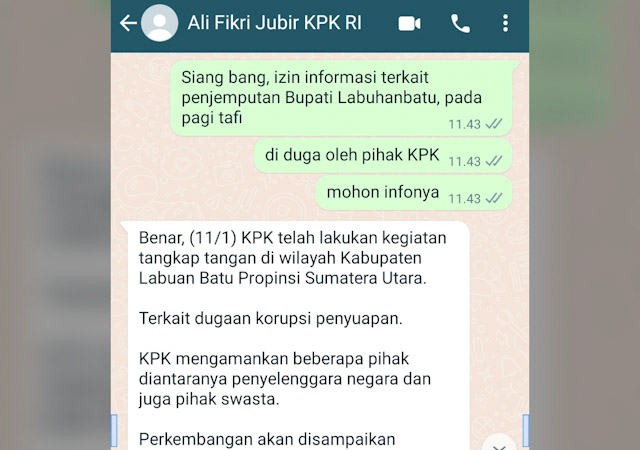 Dalam pesan singkatnya lewat WA, Juru bicara KPK RI Ali Fikri membenarkan Bupati ikut terjaring, Tim KPK telah lakukan kegiatan tangkap tangan (OTT) di wilayah Kabupaten Labuan Batu Propinsi Sumatera Utara.