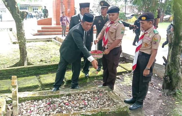 Peletakan karangan bunga dan tabur bunga ini disertai dengan memanjatkan do’a sebagai bentuk penghargaan dan penghormatan kepada para Pahlawan yang gugur di Medan perang.(Saragi).